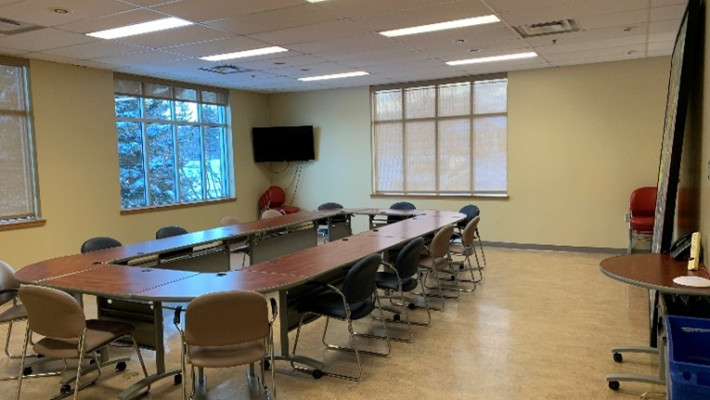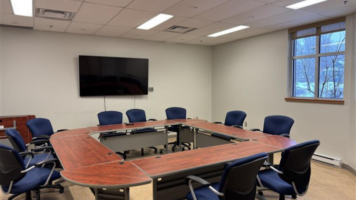 Cette salle offre toutes les commodités pour les réunions, petites activités ou cours. Elle est dotée d’un tableau blanc et d'une télé 75''.